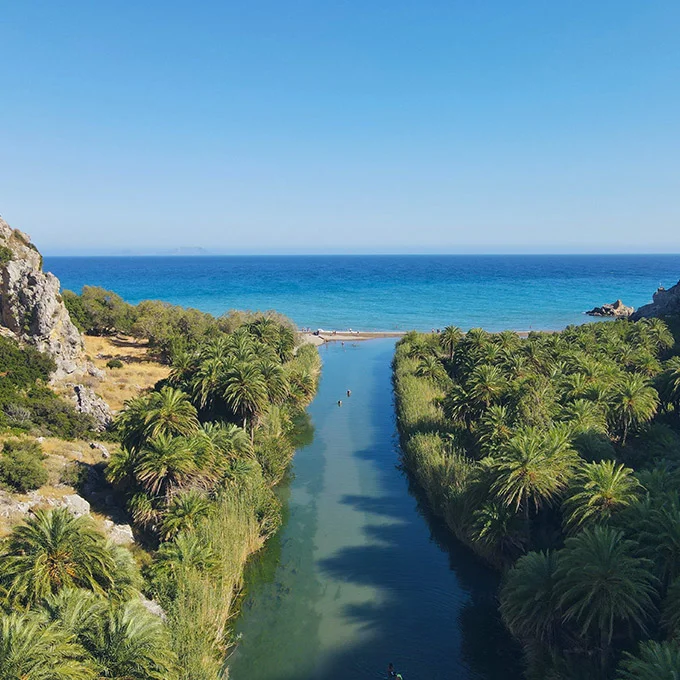 Preveli Beach, at the exit of the impressive Kourtaliotis Gorge, is just 40 minutes from Gerani. The drive through the gorge is enchanting. Palm trees along the riverbanks add an exotic atmosphere. You can walk along the river in the shade of the trees, explore the gorge, and swim in the cool natural pools formed there.